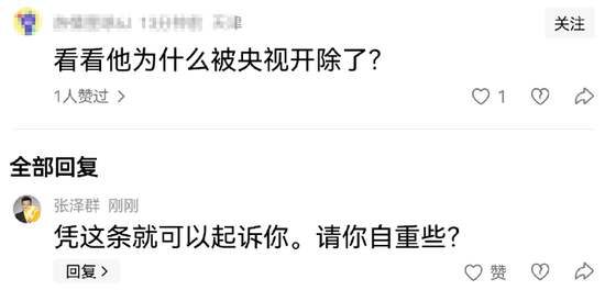 张泽群晒出的截图显示,有网友在评论区称:“看看他为什么被央视开除了?”张泽群则在该网友评论下回复:“凭这条就可以起诉你,请你自重些?”