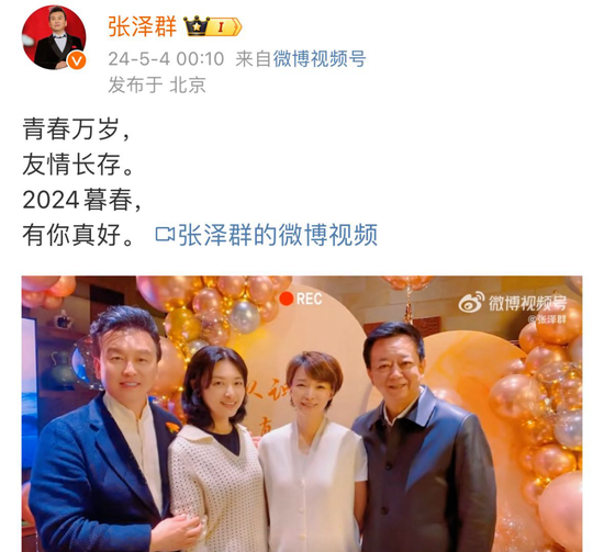 2024年5月4日凌晨,张泽群在社交平台晒出了与周涛、董卿、朱军的同框照,他写道:“青春万岁,友情长存。2024暮春,有你真好。”