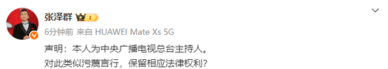 张泽群写道:“声明:本人为中央广播电视总台主持人。对此类似污蔑言行,保留相应法律权利?”